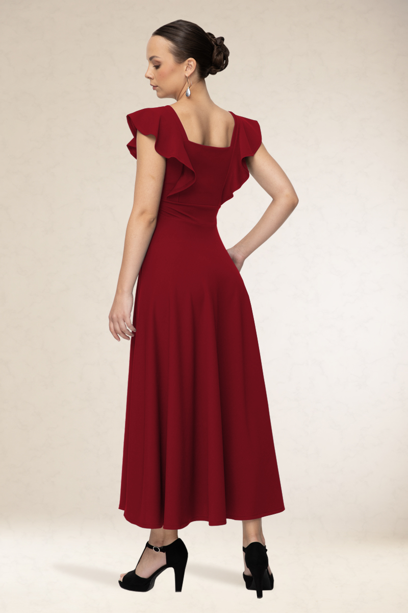 Derékban karcsúsított, hosszú alkalmi ruha. Különlegessége a vállain végig futó mutatós fodor.
