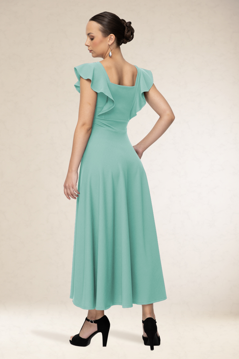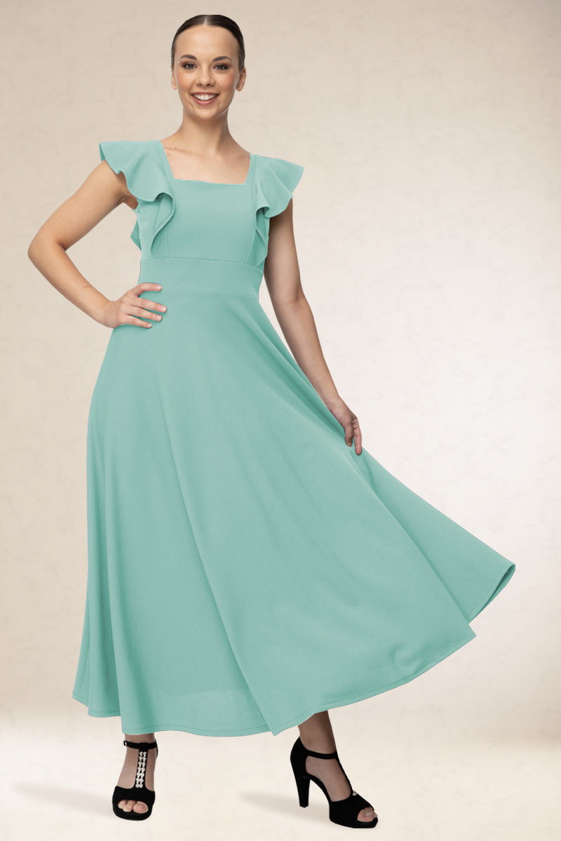 Derékban karcsúsított, hosszú alkalmi ruha. Különlegessége a vállain végig futó mutatós fodor.