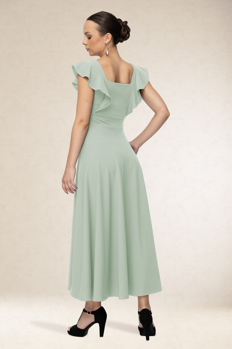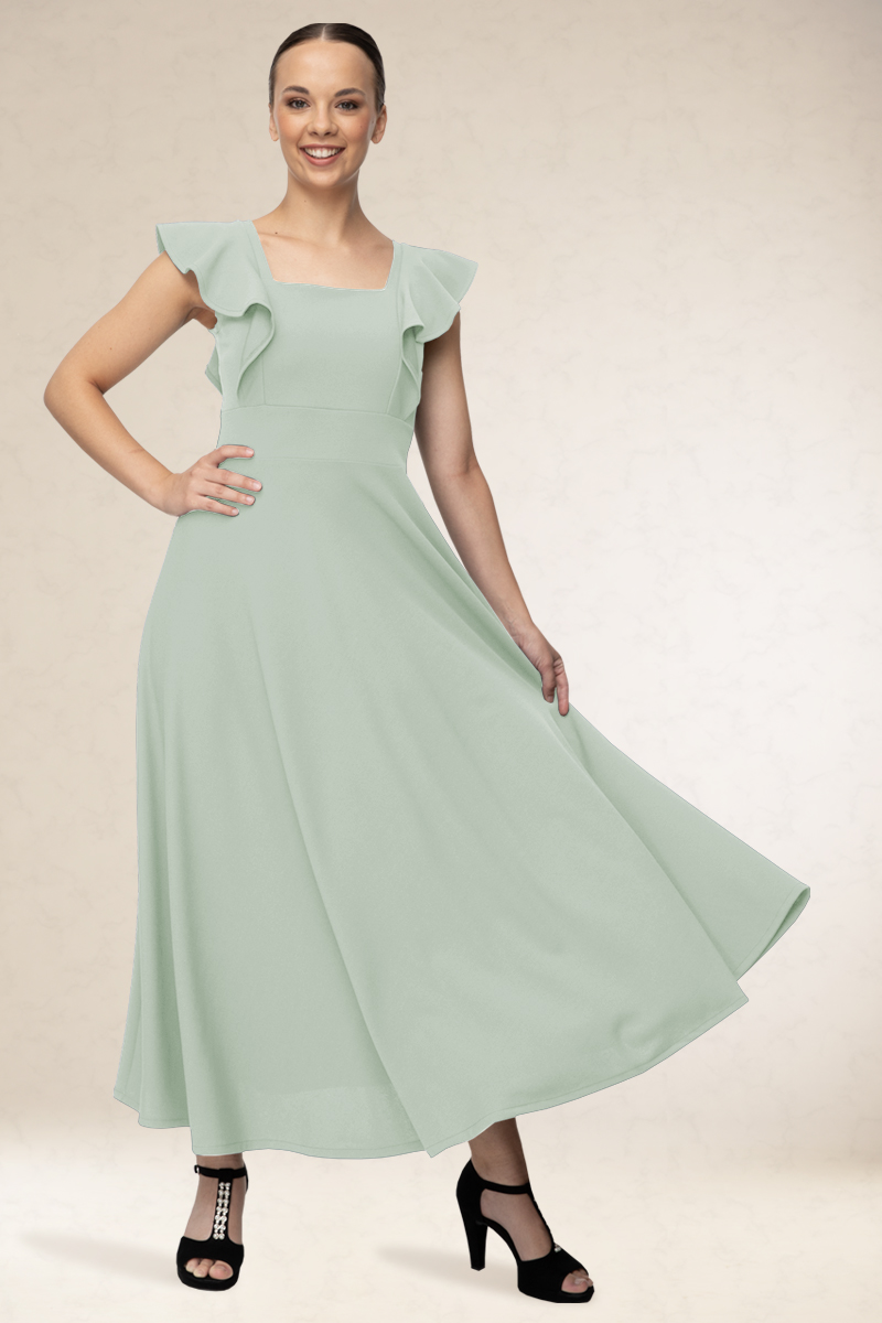 Derékban karcsúsított, hosszú alkalmi ruha. Különlegessége a vállain végig futó mutatós fodor.