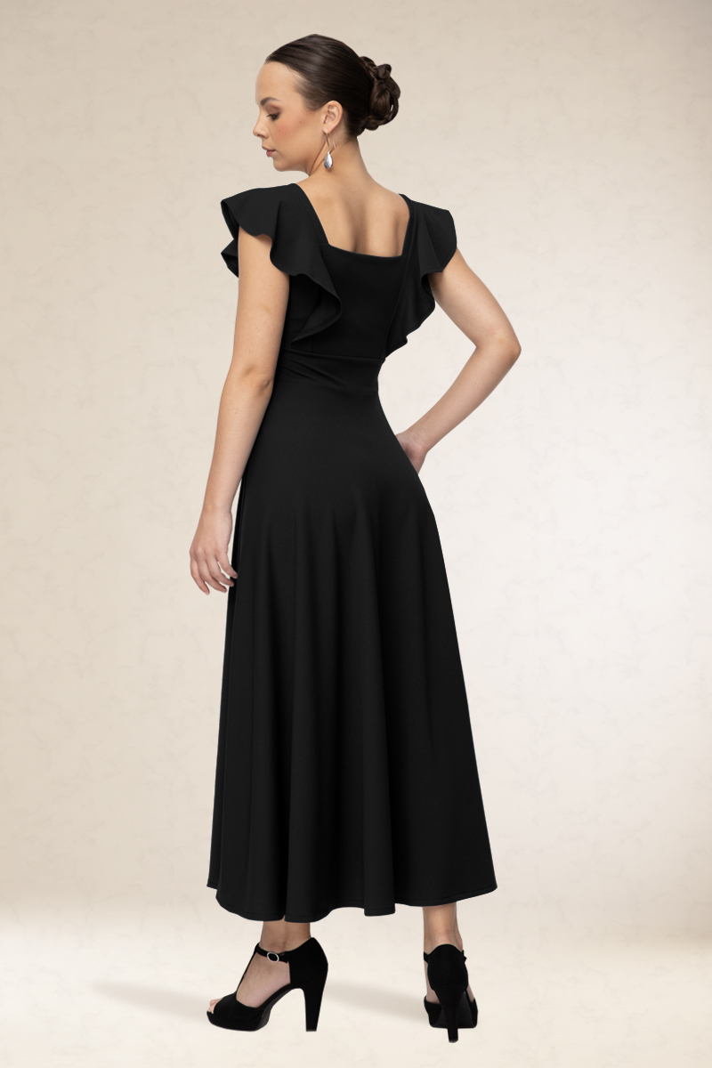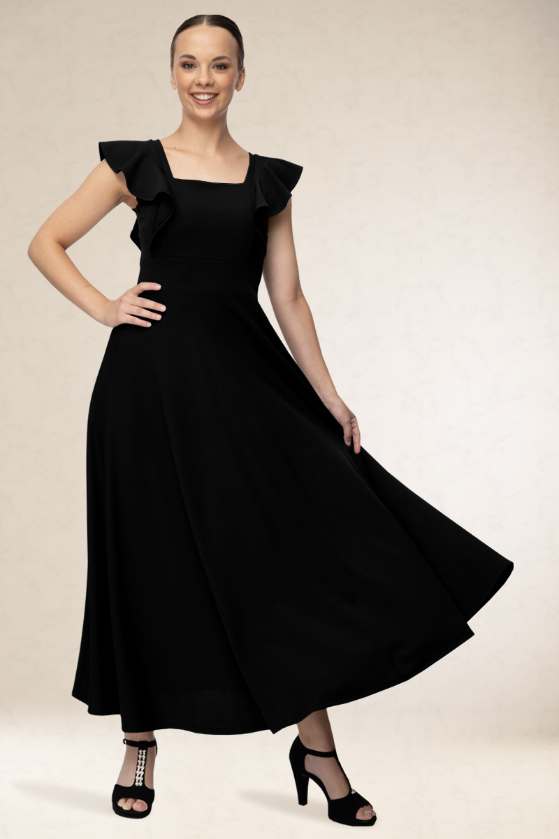 Derékban karcsúsított, hosszú alkalmi ruha. Különlegessége a vállain végig futó mutatós fodor.