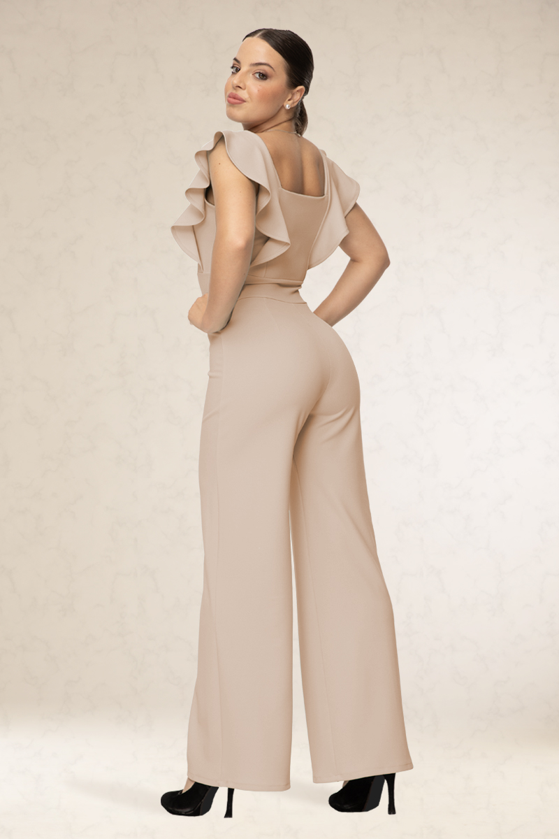 Derékban karcsúsított, overál. Különlegessége a vállain végig futó mutatós fodor.