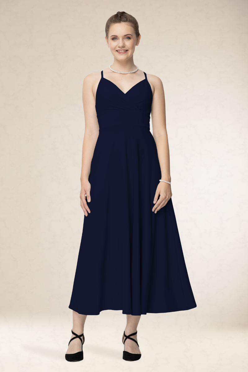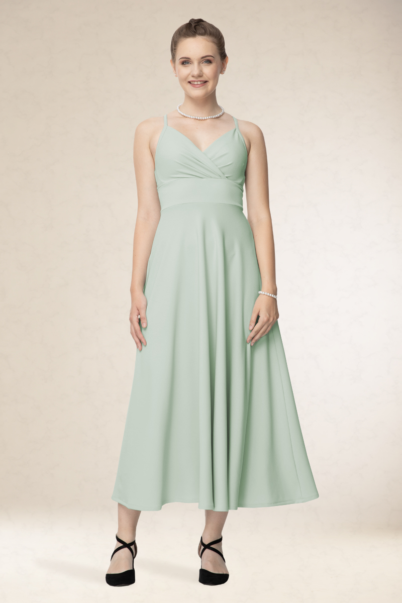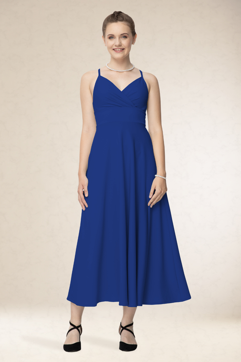 Derékban karcsúsított, spagetti pántos, hosszú alkalmi ruha.