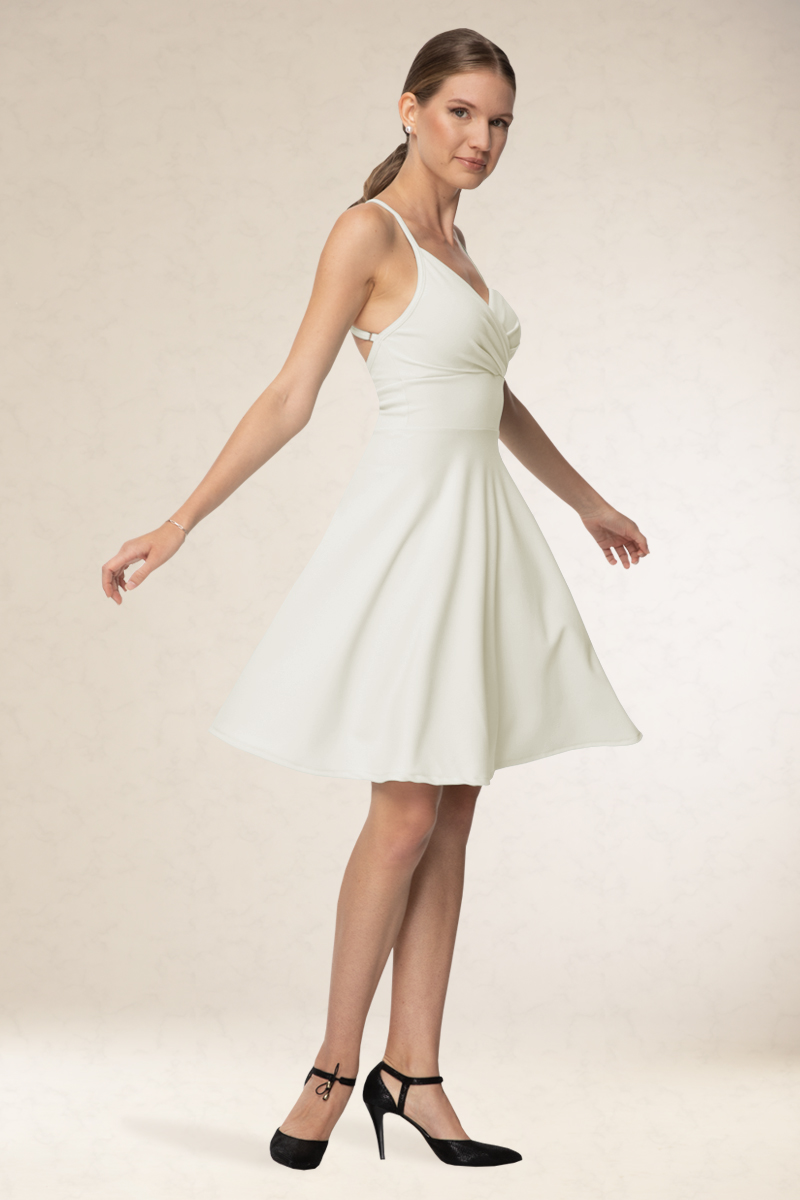 Derékban karcsúsított, spagetti pántos, rövid alkalmi ruha. Sokak kedvence, a nyitott háta miatt.