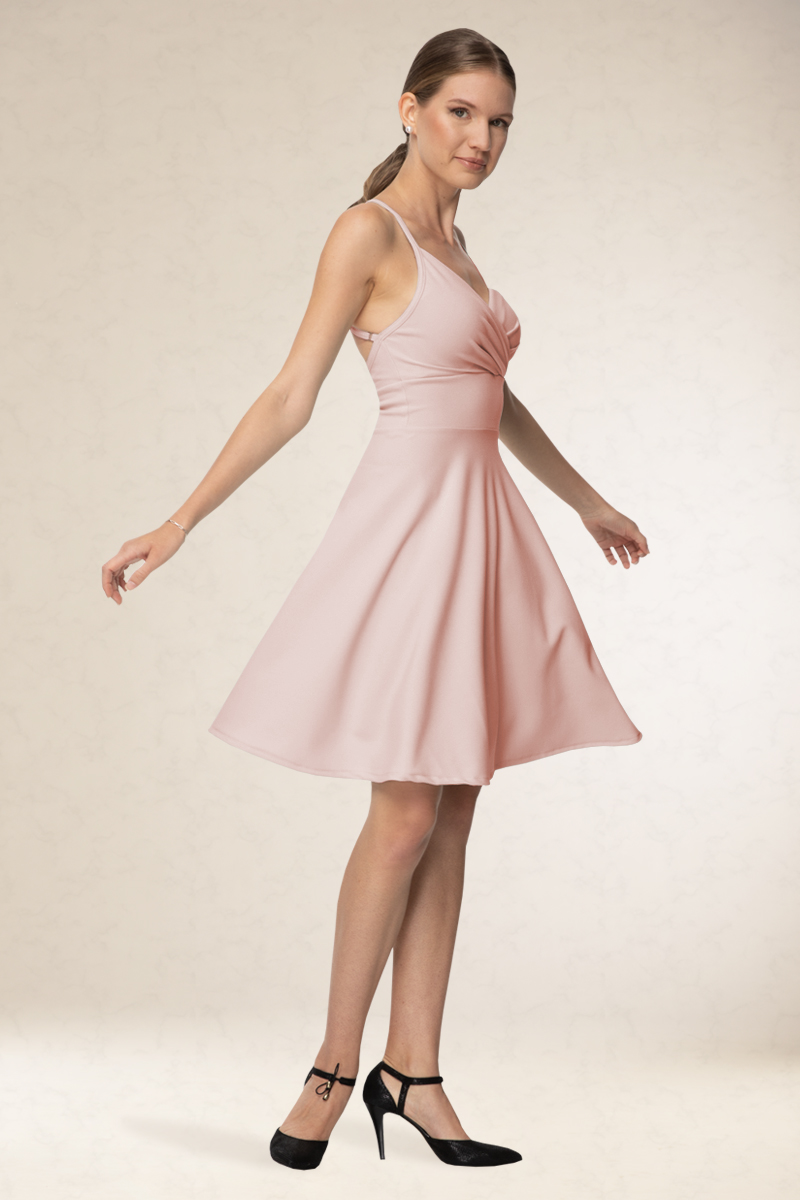 Derékban karcsúsított, spagetti pántos, rövid alkalmi ruha. Sokak kedvence, a nyitott háta miatt.