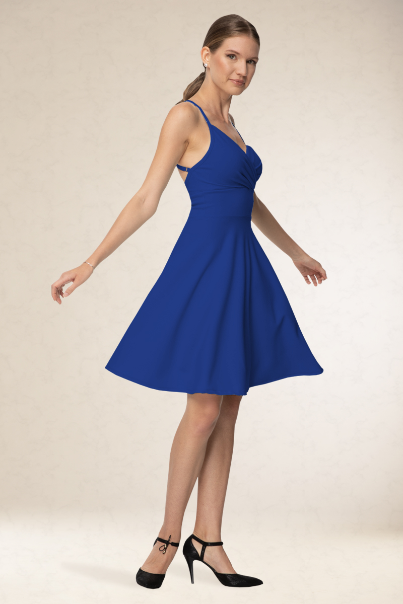 Derékban karcsúsított, spagetti pántos, rövid alkalmi ruha. Sokak kedvence, a nyitott háta miatt.