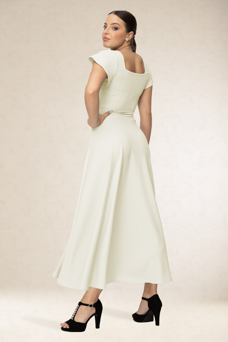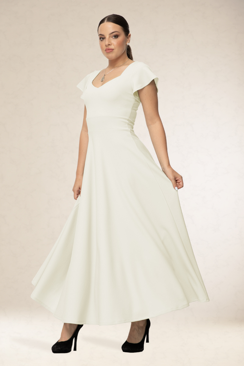 Derékban karcsúsított, hosszú alkalmi ruha, szív alakú kivágással, pici ujjával. 14 színben rendelhető.