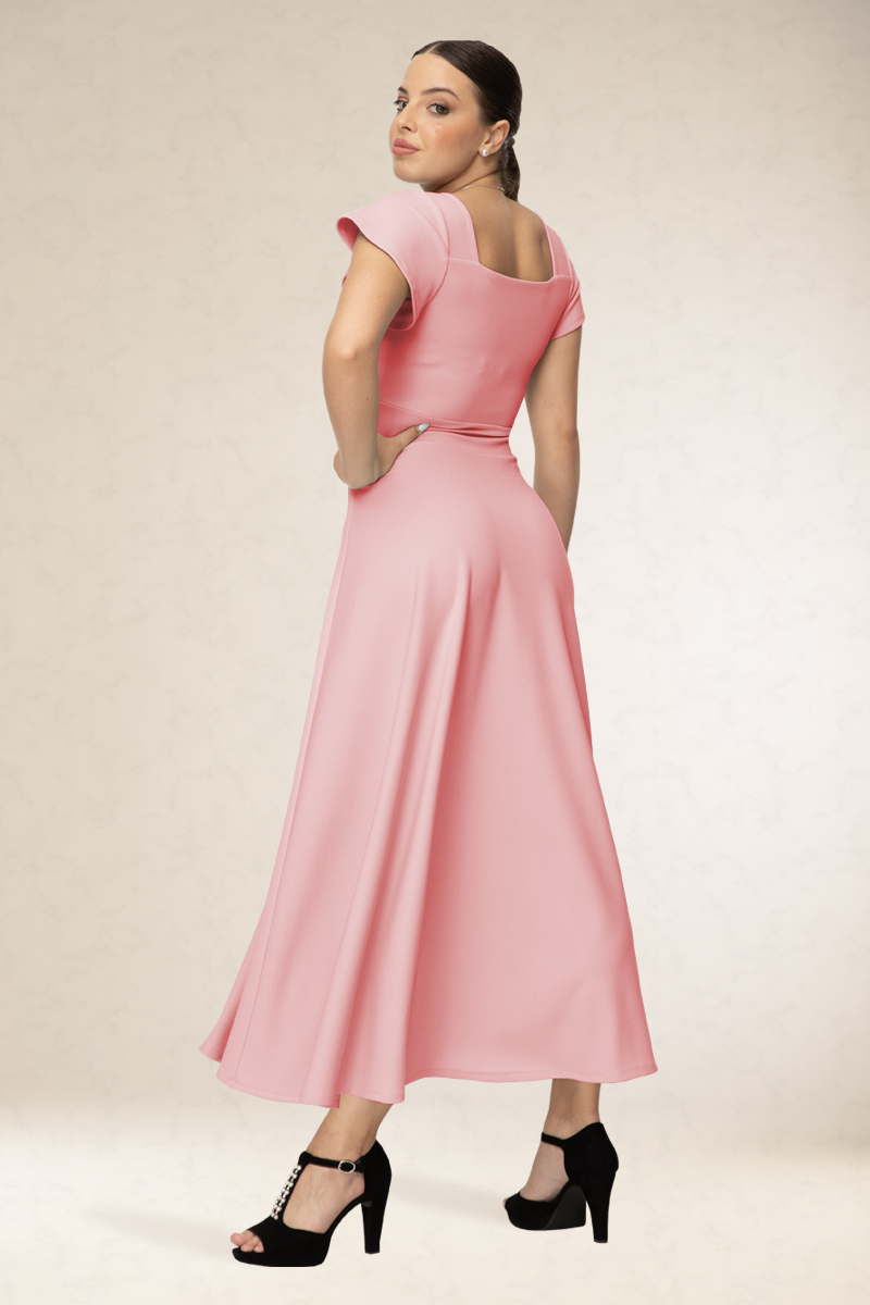Hosszú alkalmi ruha, rugalmas alapanyagból. Szív alakú kivágással, rövid ujjával. Kényelmes viselet. Könnyen kezelhető, nem gyűrődik. Ajánljuk ballagásra vagy szalagavatóra.