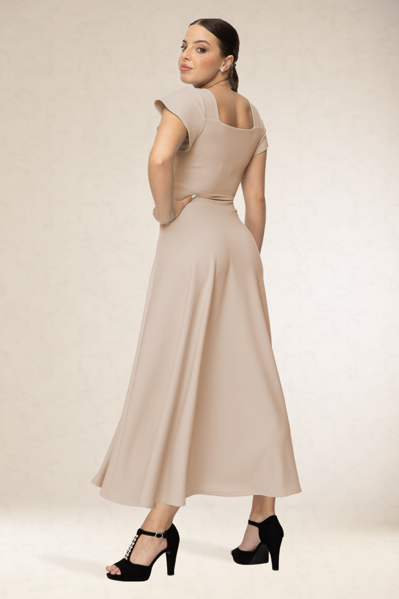 Derékban karcsúsított, hosszú alkalmi ruha, szív alakú kivágással, pici ujjával. 14 színben rendelhető.