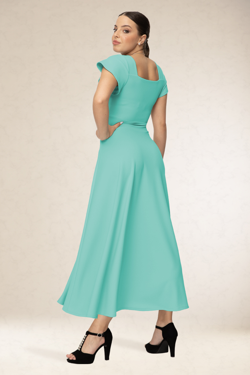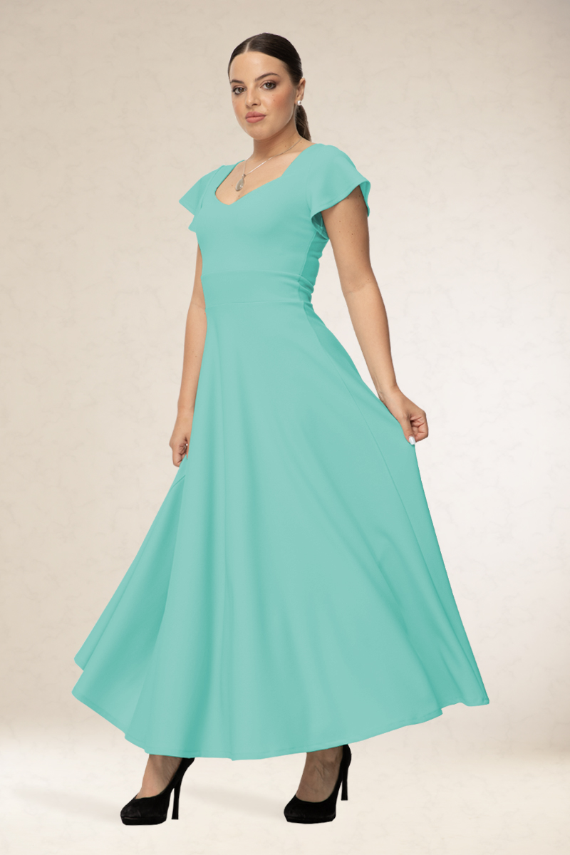 Derékban karcsúsított, hosszú alkalmi ruha, szív alakú kivágással, pici ujjával. 14 színben rendelhető.