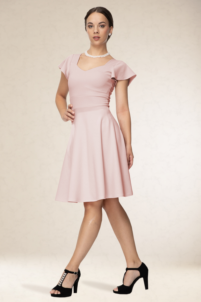 Derékban karcsúsított, rövid alkalmi ruha, szív alakú kivágással, pici ujjával. Nyolcadikosoknak kifejezetten jó választás. 14 színben kapható.