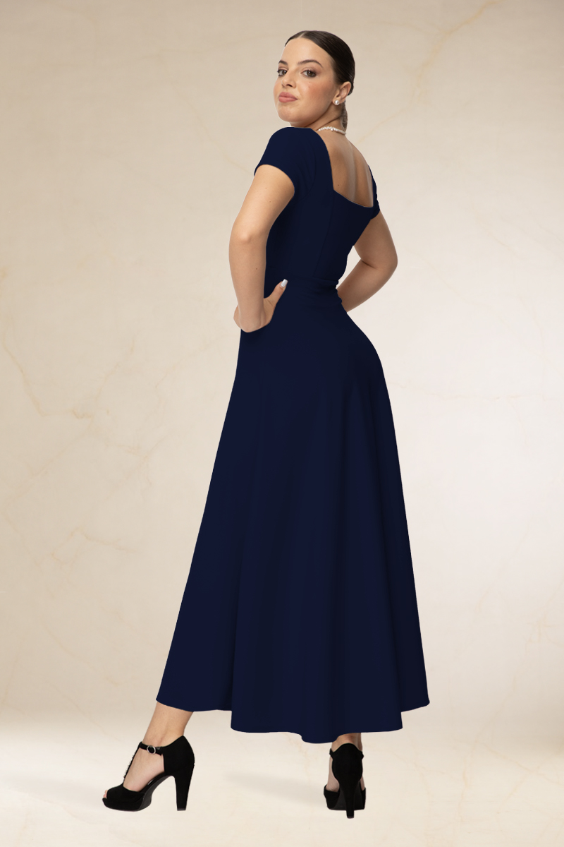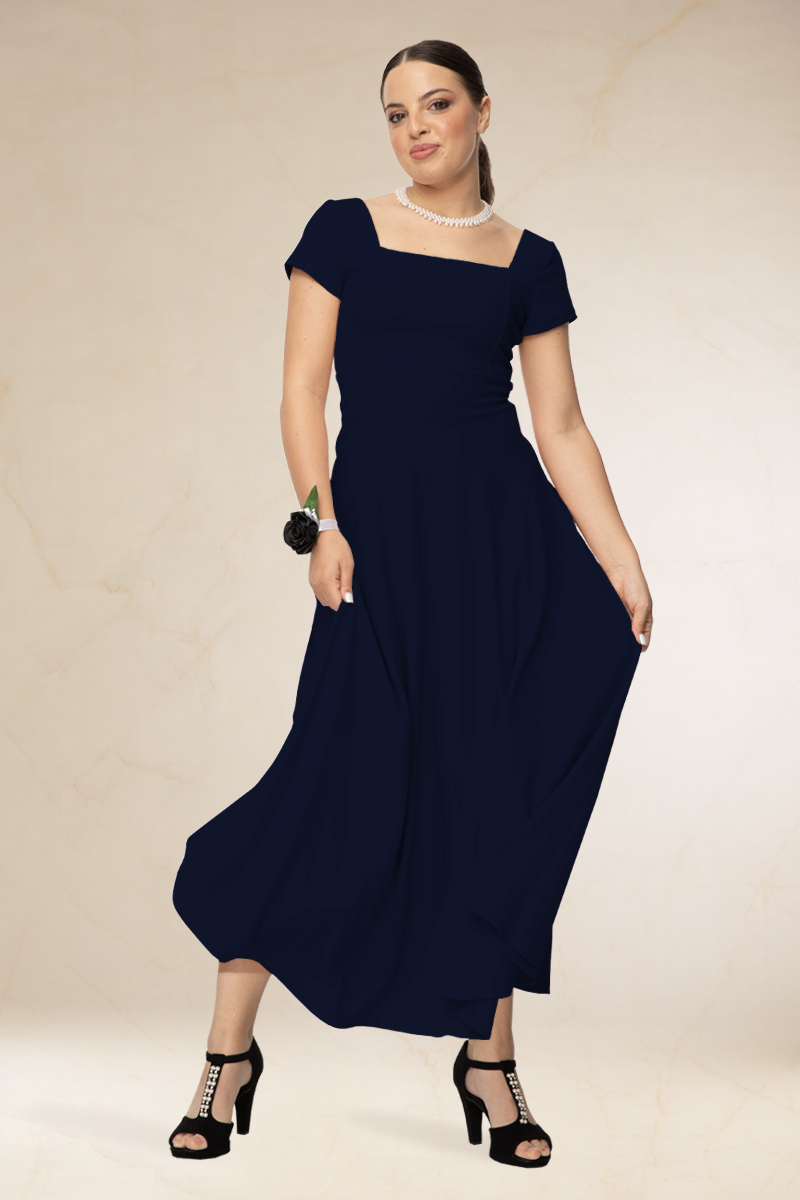 Derékban karcsúsított, szögletes kivágású, hosszú alkalmi ruha, pici ujjával.