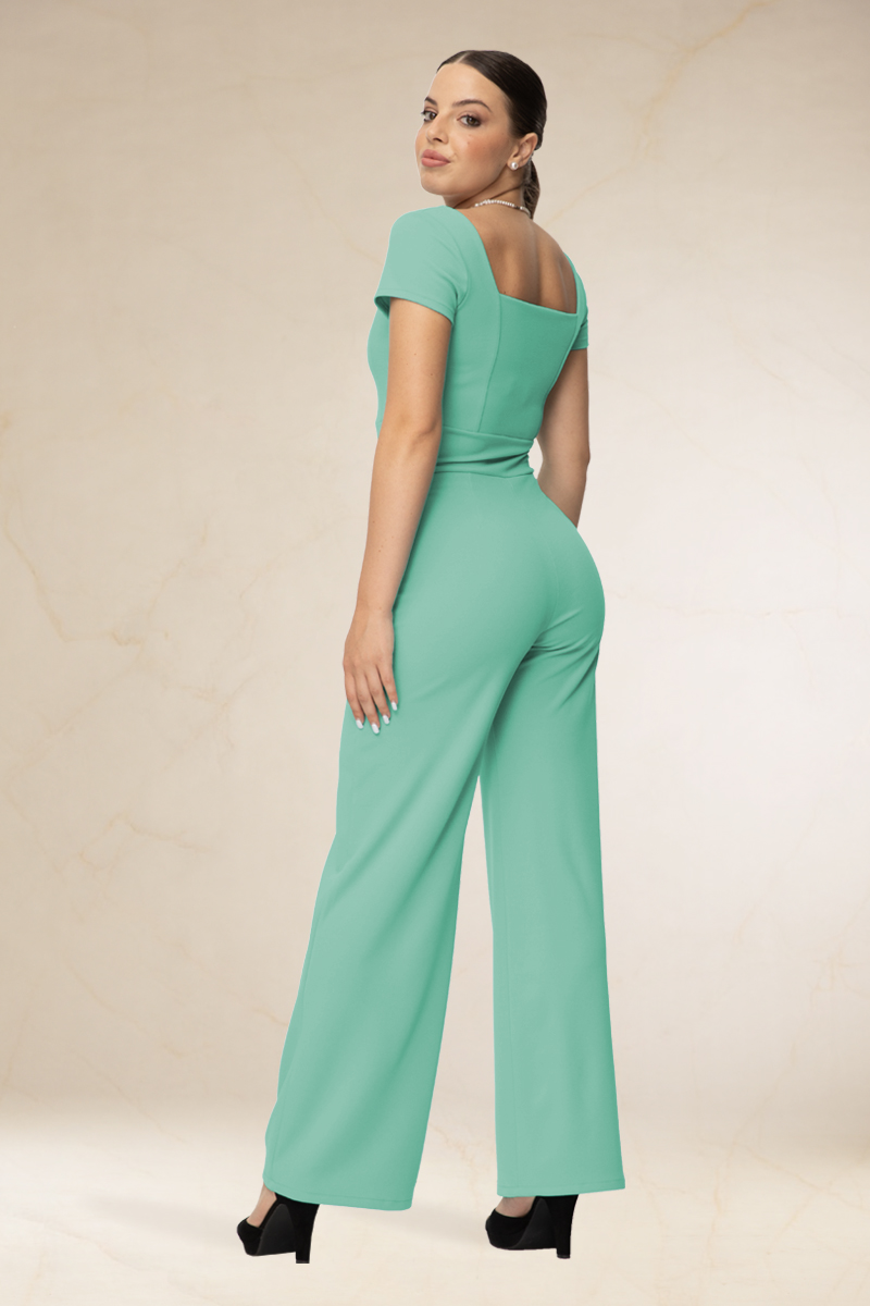 Derékban karcsúsított, szögletes kivágású, overál, rövid ujjával. Szolid nem kihívó fazon.