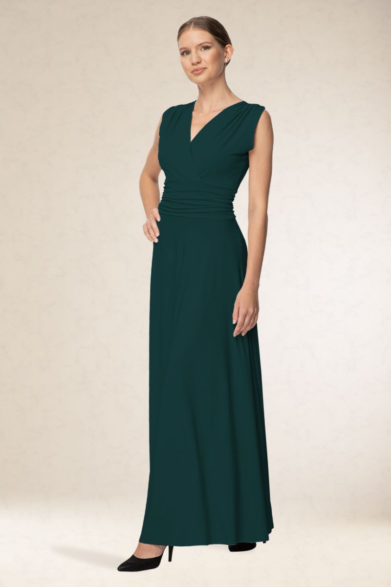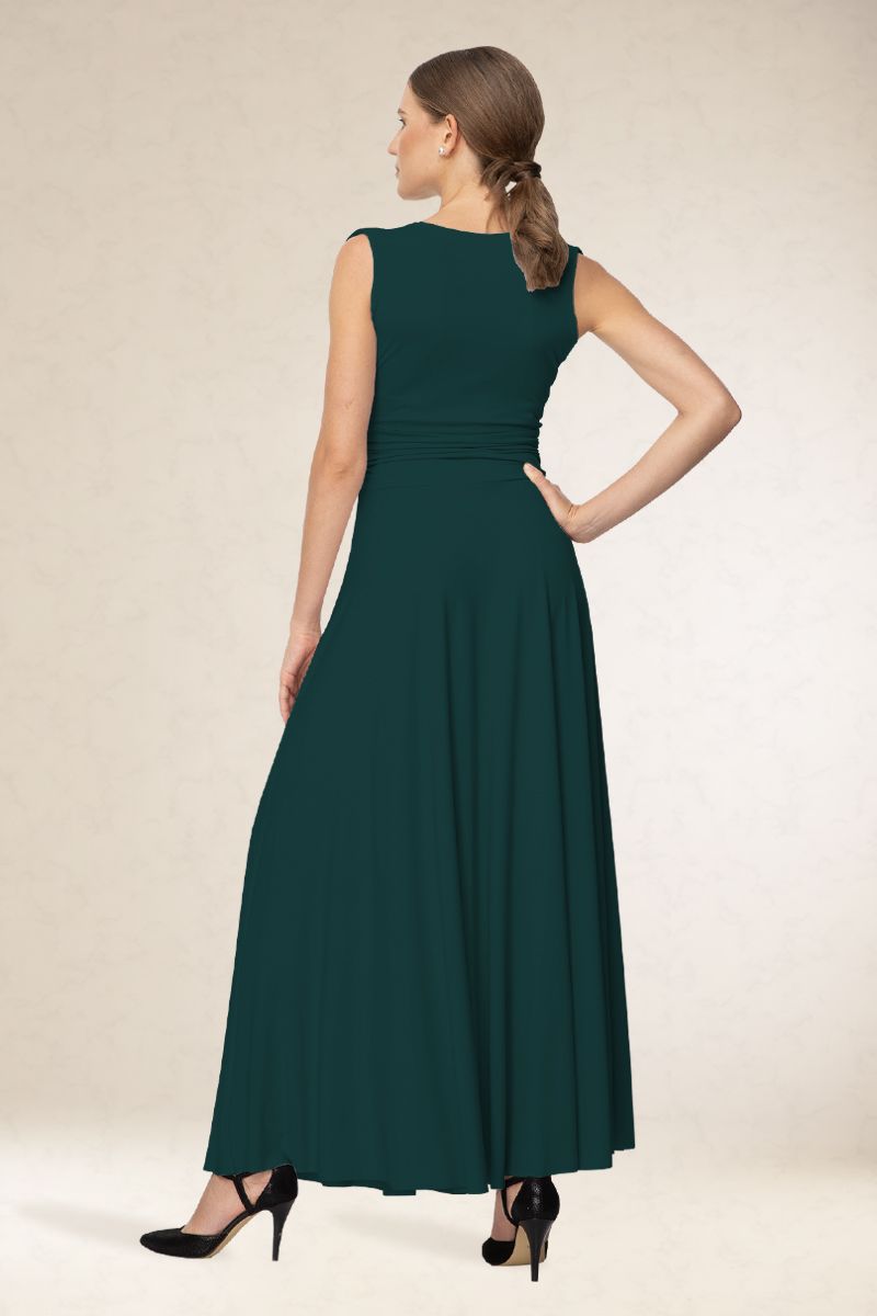 Vállán és derekán húzott, hosszú alkalmi ruha. Visszafogott, elegáns fazon.
