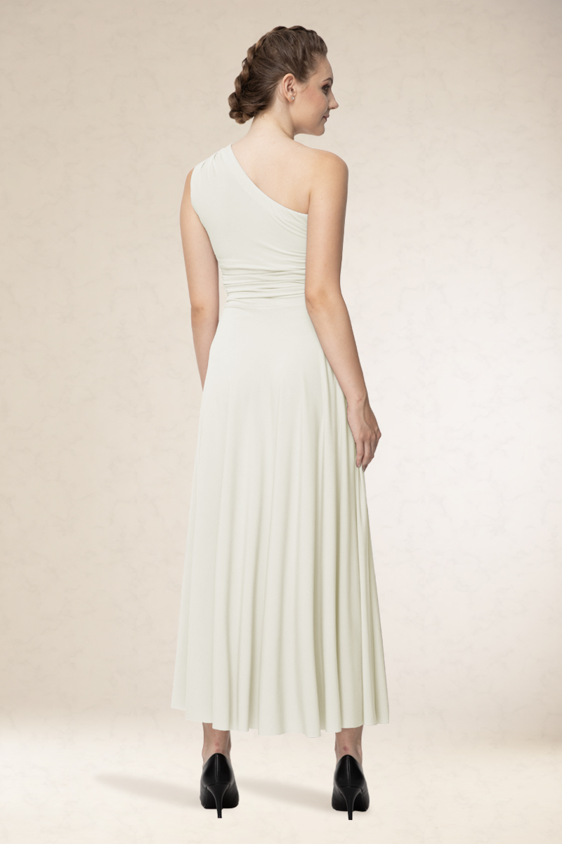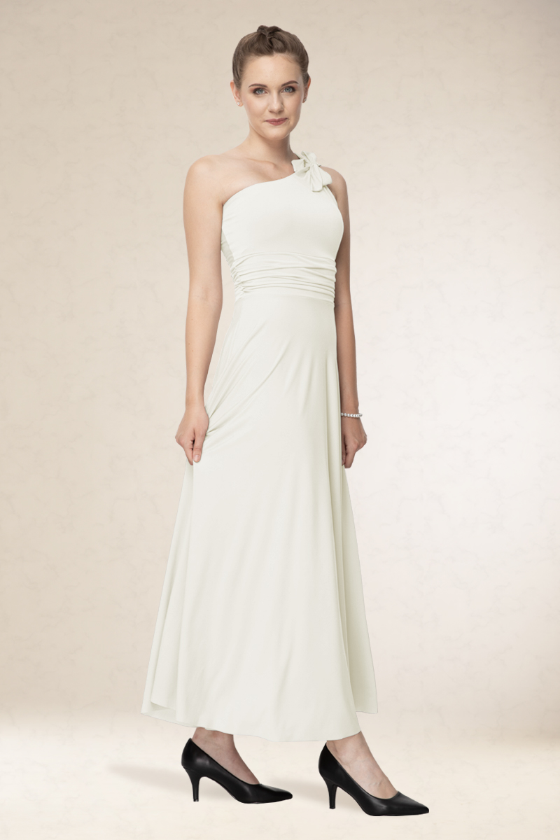 Hosszú alkalmi ruha, ferdevállas fazon, variálható díszítéssel. Kényelmes viselet. Könnyen kezelhető, nem gyűrődik. Ajánljuk szalagavatóra vagy koszorúslányoknak, sötétebb színeit színházba, vagy estélyre.