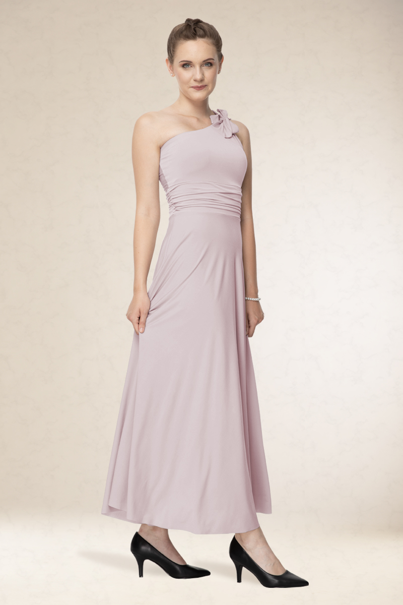 Hosszú alkalmi ruha, ferdevállas fazon, variálható díszítéssel. Kényelmes viselet. Könnyen kezelhető, nem gyűrődik. Ajánljuk szalagavatóra vagy koszorúslányoknak, sötétebb színeit színházba, vagy estélyre.