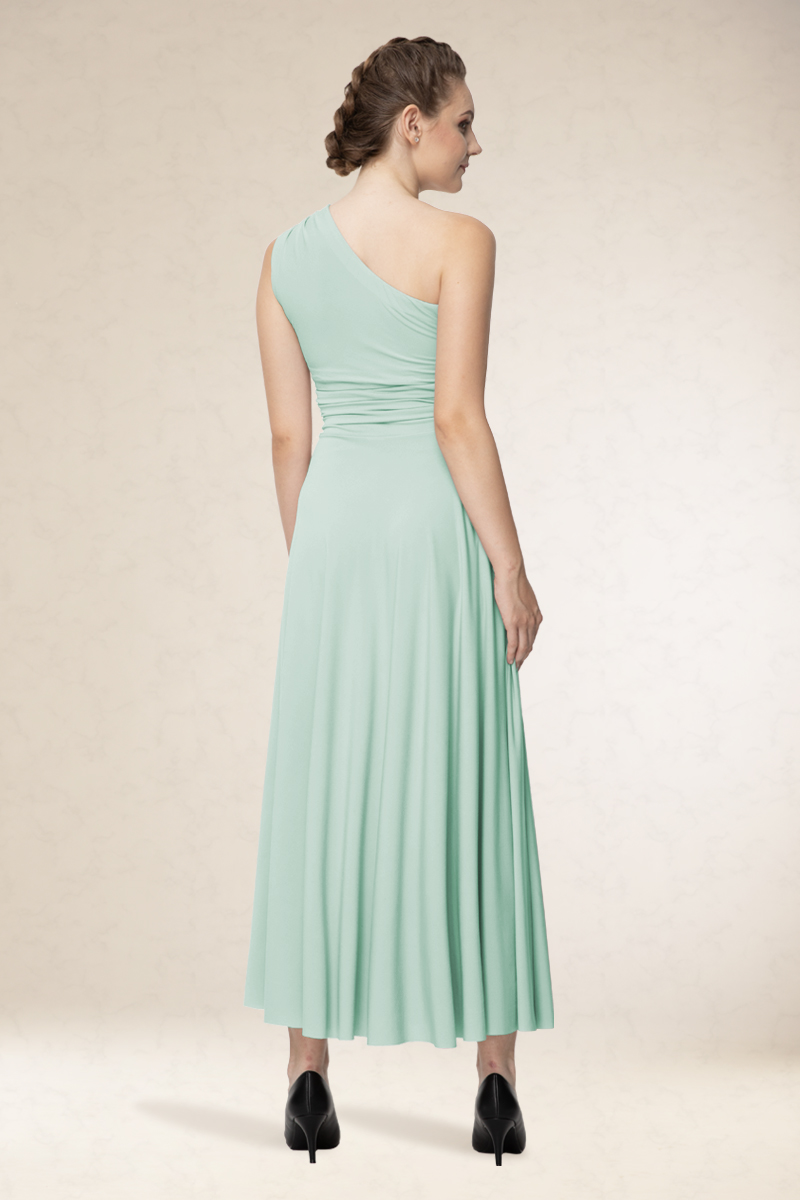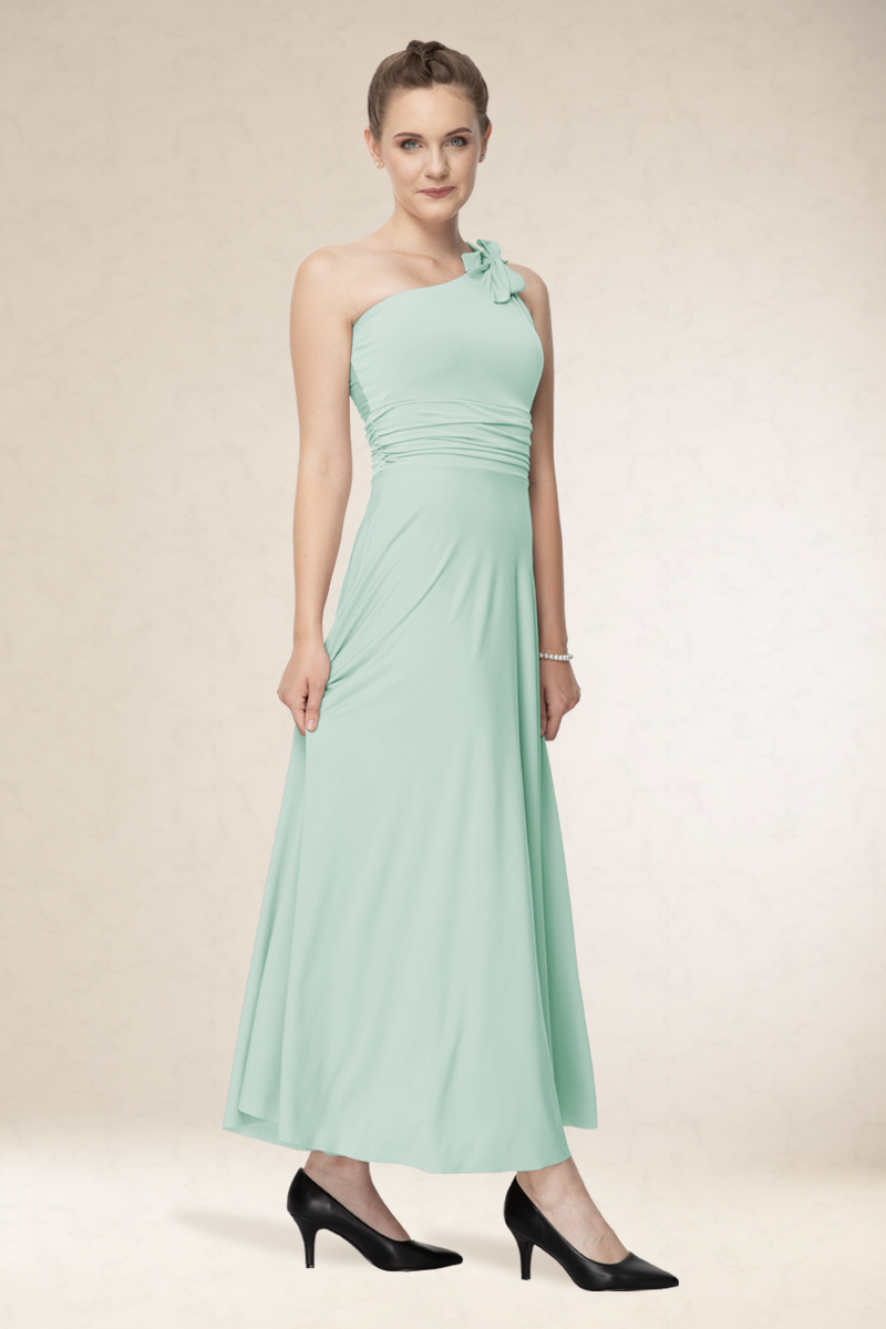 Hosszú alkalmi ruha, ferdevállas fazon, variálható díszítéssel. Kényelmes viselet. Könnyen kezelhető, nem gyűrődik. Ajánljuk szalagavatóra vagy koszorúslányoknak, sötétebb színeit színházba, vagy estélyre.