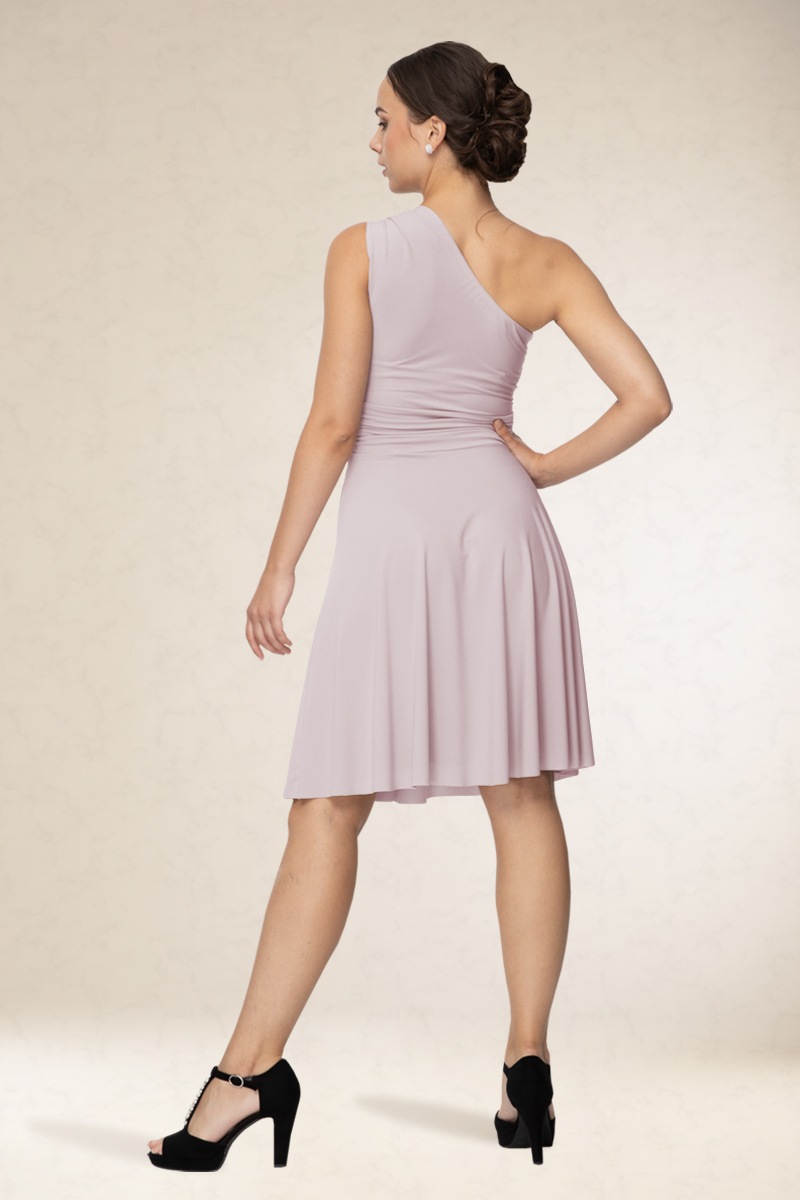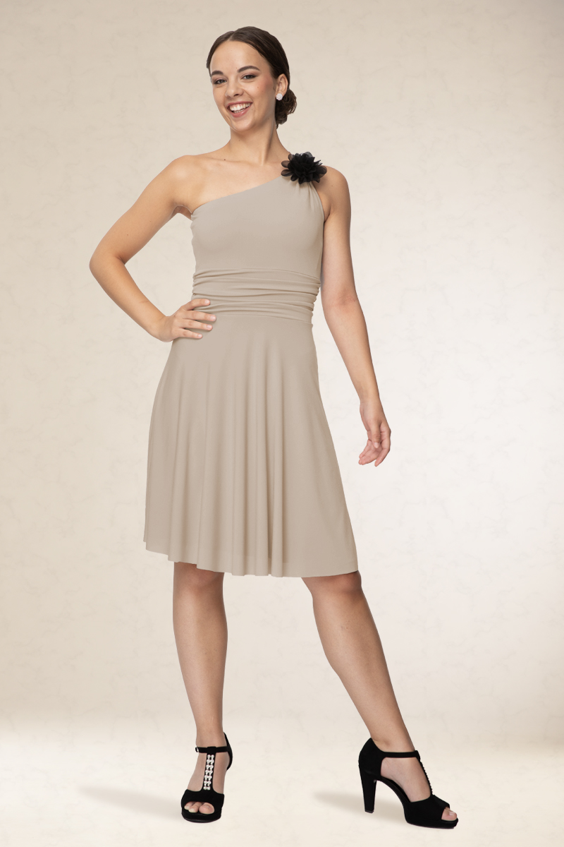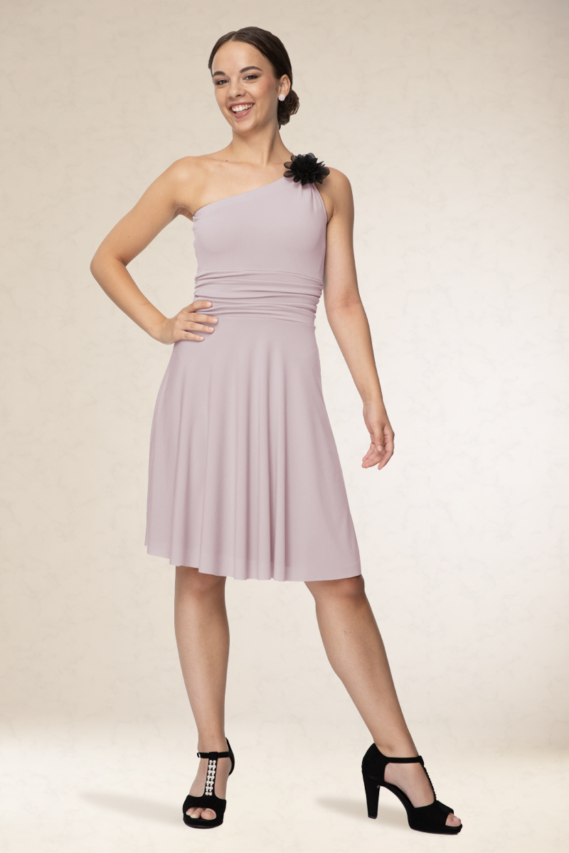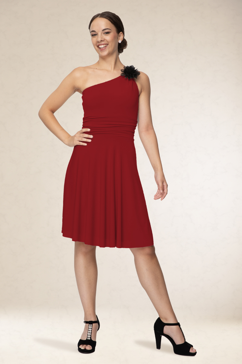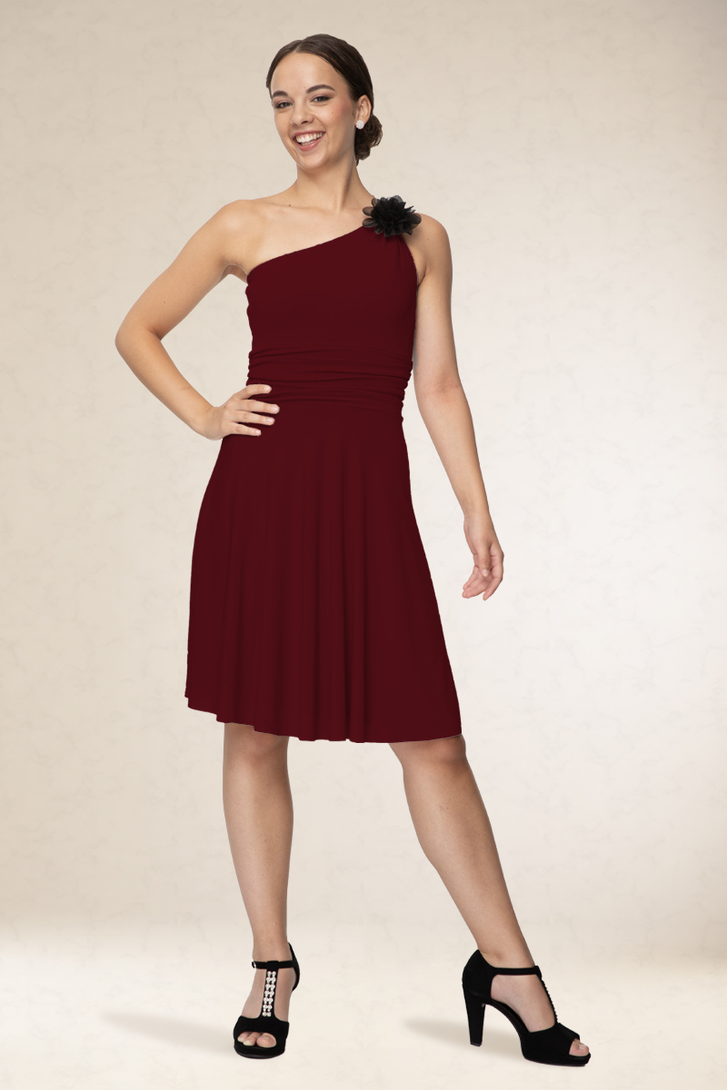 Rövid alkalmi ruha, ferdevállas fazon, a vállán variálható díszítéssel. Kényelmes viselet. Könnyen kezelhető, nem gyűrődik. Ajánljuk szalagavatóra vagy koszorúslányoknak, sötétebb színeit színházba, vagy estélyre.