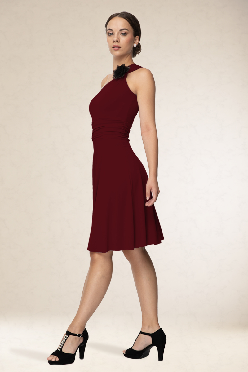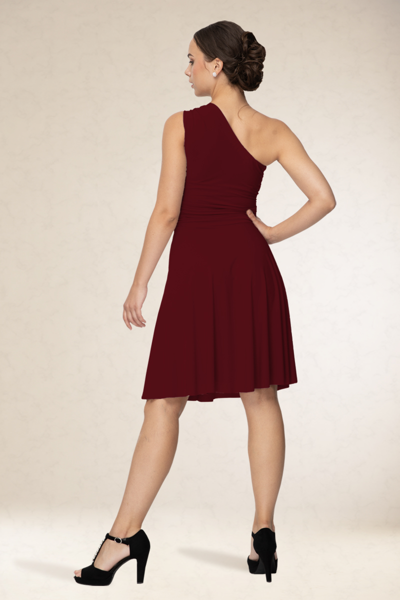 Rövid alkalmi ruha, ferdevállas fazon, a vállán variálható díszítéssel. Kényelmes viselet. Könnyen kezelhető, nem gyűrődik. Ajánljuk szalagavatóra vagy koszorúslányoknak, sötétebb színeit színházba, vagy estélyre.
