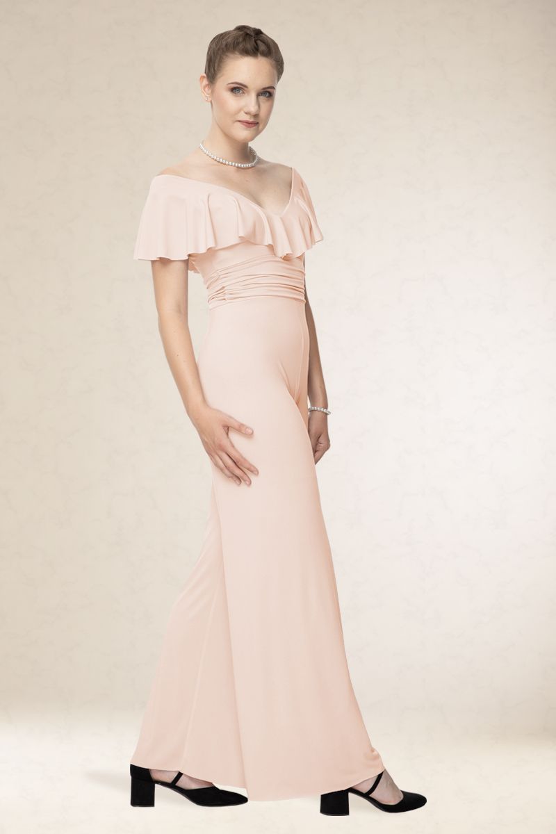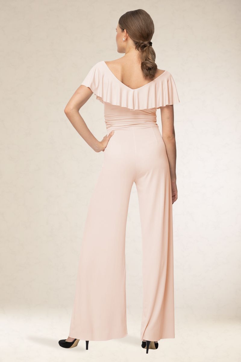 Elegáns overál, rugalmas alapanyagból, elején fodorral díszítve.