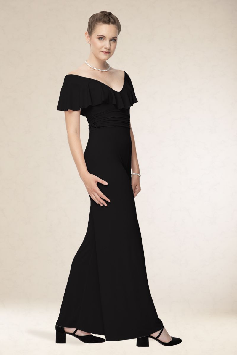 Elegáns overál, rugalmas alapanyagból, elején fodorral díszítve.