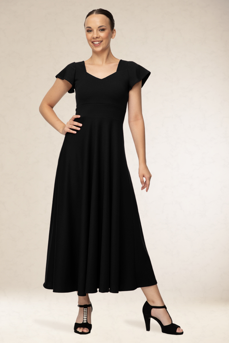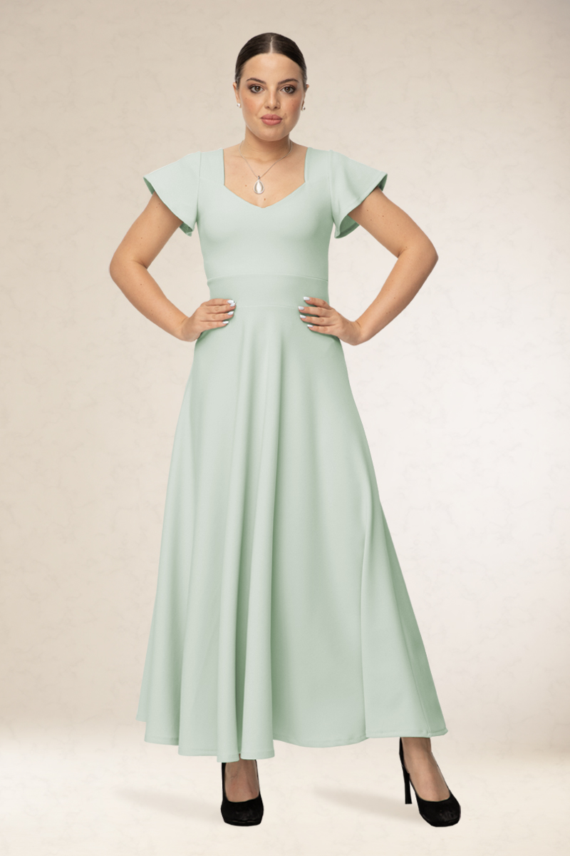 Hosszú alkalmi ruha, rugalmas alapanyagból. Szív alakú kivágással, rövid ujjával. Kényelmes viselet. Könnyen kezelhető, nem gyűrődik. Ajánljuk ballagásra vagy szalagavatóra.