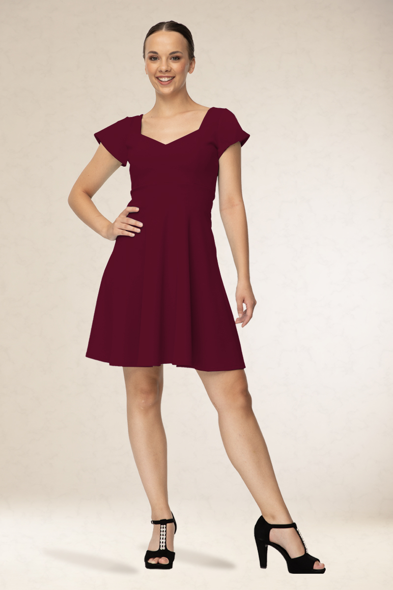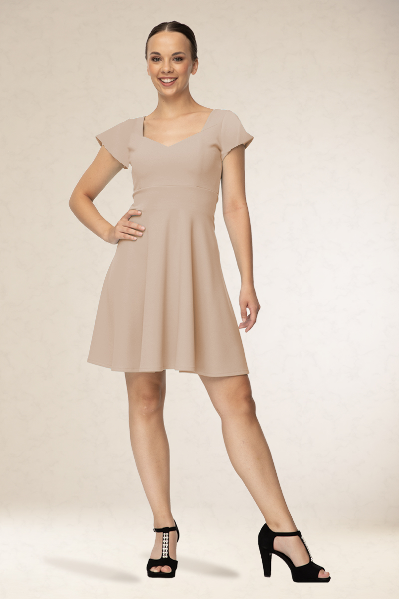 Rövid koktél ruha, rugalmas alapanyagból. Szív alakú kivágással, pici ujjával. Kényelmes viselet, nem gyűrődik. Ideális viselet álltalános iskolai ballagásra, szalagavatóra, de később is jól kihasználható.